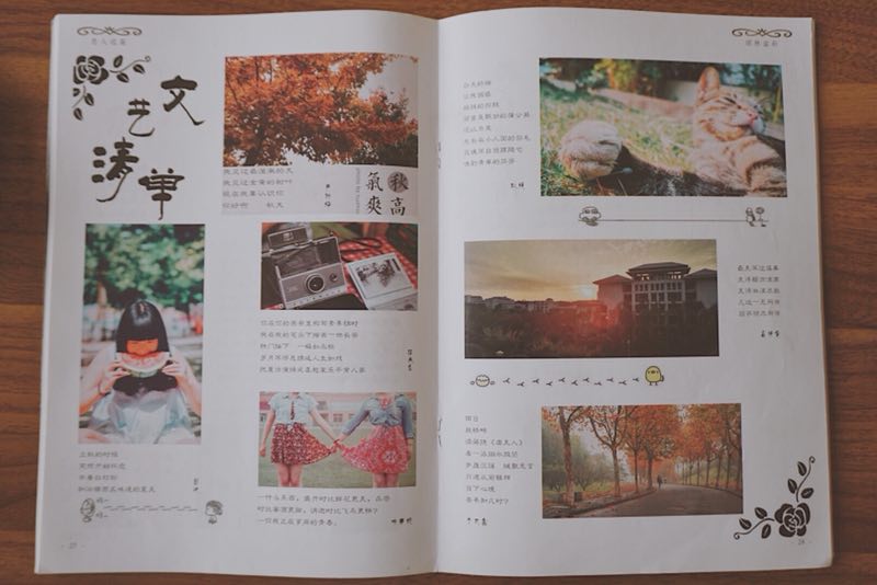 “你若遇见秋意,请替我问好”,这是我所编辑的第一本杂志的背封语,跟当时荻思文学社的小伙伴们一起跟着教程从零开始学习制作,编辑完成后,我们不断讨论了影印机构、打印纸张、封面形式等等,过程中栽了很多跟斗,但大家一直互相鼓励,直至最后完成发刊,我们拿着杂志,把“这是我们的孩子”当玩笑话说出来,但又何尝不是我的心声。有了经验后,杂志编辑便没有一开始那么艰辛。2016年5月,王军老师给了我编辑制作av电影 与荻思合作的杂志的机会,那是13级av电影 小说专刊,其中我个人认为比较“特别”的一点是,这本杂志的作者署名全部是亲笔手写,收集签名的过程是无比欢乐的,之后的编辑过程中看到这些签名,不由产生“见字如面”的感想,会情不自禁地按照个人特色为他们编辑。不仅对学长学姐们,这本杂志对我来说也非常特别,之后老师和学姐严格的校对和更改让我对它充满了信心,尤其是亲手拿到成品,那种惊喜的感觉,直到如今都记忆犹新。后来,王军老师又推荐我制作澄园书院的“澄典”杂志,杂志中刊登的是澄园书院同学的作品,内容十分丰富,这次有选稿的权利,挑选了其中比较优秀的作品进行编辑,个人比较喜欢这次杂志的风格。每次制作出可以发刊的杂志都让人十足有成就感,每一本杂志对我来说存在着特别的意义,这也成为我大学生活中难得的珍贵记忆。