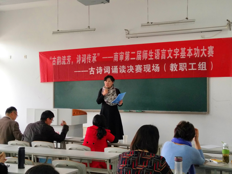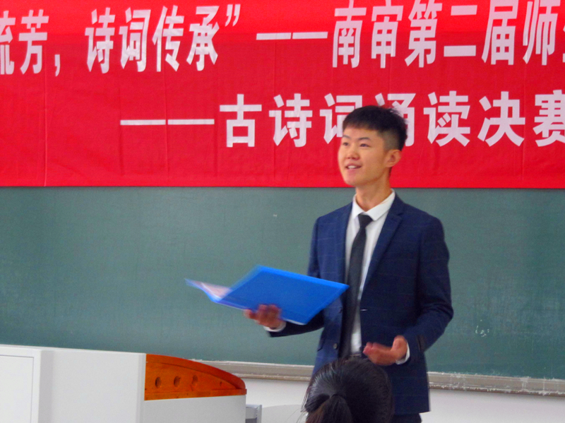 在“古诗词诵读”学生组和教工组比赛现场,从《山居秋暝》到《滕王阁》;从《春江花月夜》到《将进酒》,无论是自选诗词还是评委指定诗词,所选取的经典古诗词作品多元丰富,选手们或激情澎湃,气势夺人;或深情款款,浅吟低诵,声情并茂地用声音演绎经典,抑扬顿挫间尽显文化魅力,充分展示着南审师生们对中国古典诗词文化的热爱。
