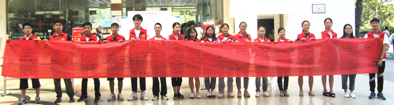 活动现场,校语委主任董必荣副校长;程乃胜、刘顺副主任对我校语言文字及普测中心工作进行了详细的了解和指导,同时,对校园推普宣传周活动表示赞赏和支持,领导们也积极地走到“中华人民共和国成立七十华诞祝福语签名台 ”像其他在场师生一样,真挚地写上自己对共和国七十华诞的祝福语并签上自己的名字。来到签名处的还有著名书法家刘建平教授及广大师生,大家纷纷书写着“我爱你.中国”、“祝福祖国繁荣昌盛”、“共和国万岁”等祝福留言,签名横幅上留下了几百位师生的姓名笔迹,表明了签名者对祖国真挚的情感和对普通话是校园最美丽的语言这一倡导的支持!