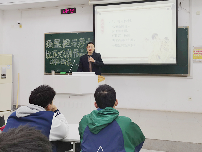 首先,施常州通过两个现场问题,引导同学了解了汤显祖和莎士比亚的生平及其代表作。随后,他通过对汤显祖代表作——《牡丹亭》的深入介绍,带领同学们明悟其辞藻华丽,想象丰富,擅用虚实结合手法来表达人物情感的特点。其次,他从《哈姆雷特》这一莎士比亚经典悲剧出发,详细分析了莎士比亚戏剧人文思想丰富,人物形象深刻,戏剧情节冲突性强等特点,并与汤显祖《牡丹亭》进行比较,使同学们深刻了解东西方戏剧文化的差异与共性。
