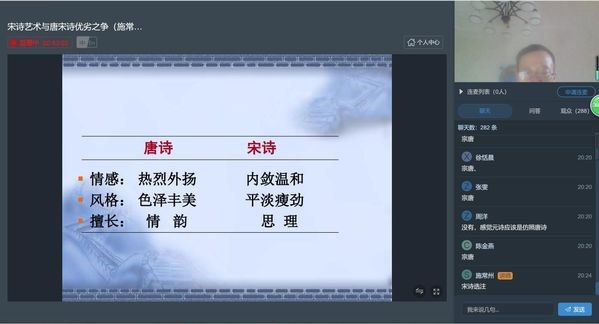 最后,施常州从内容和艺术特色两方面概括了宋诗的主要特点。通过此次讲座,同学们不仅可以认识了唐诗、宋诗的异同之处,更能领略到宋诗独创生新的艺术魅力。