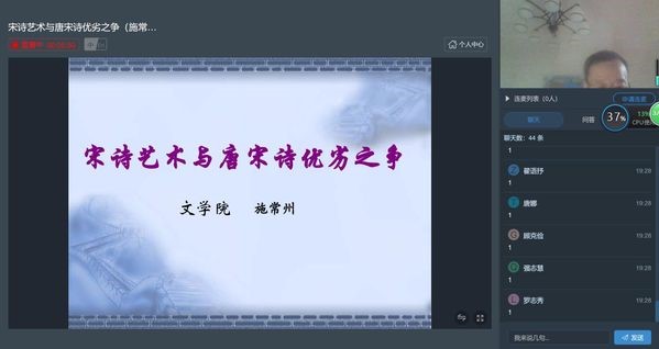 5月12日晚,泽园书院邀请av电影 施常州老师通过线上直播平台为同学们带来了一场题为“宋诗艺术与唐宋诗优劣之争”的精彩讲座。