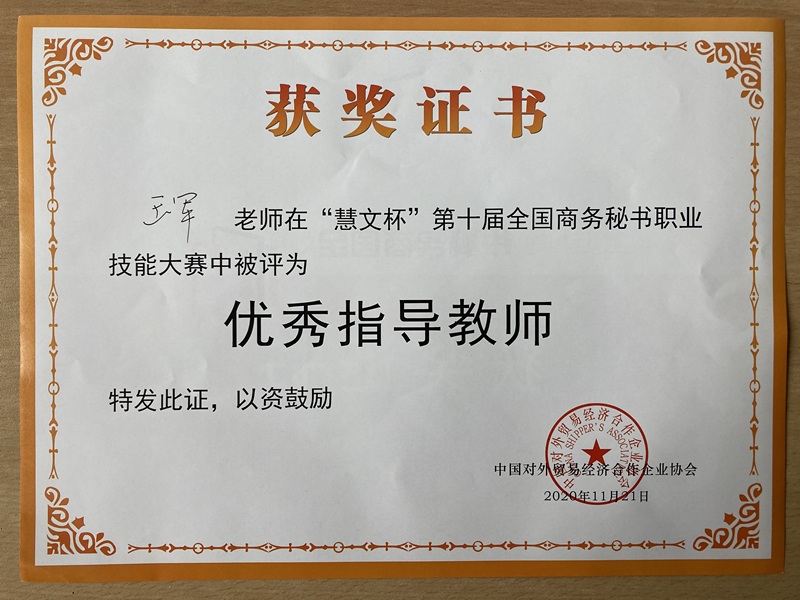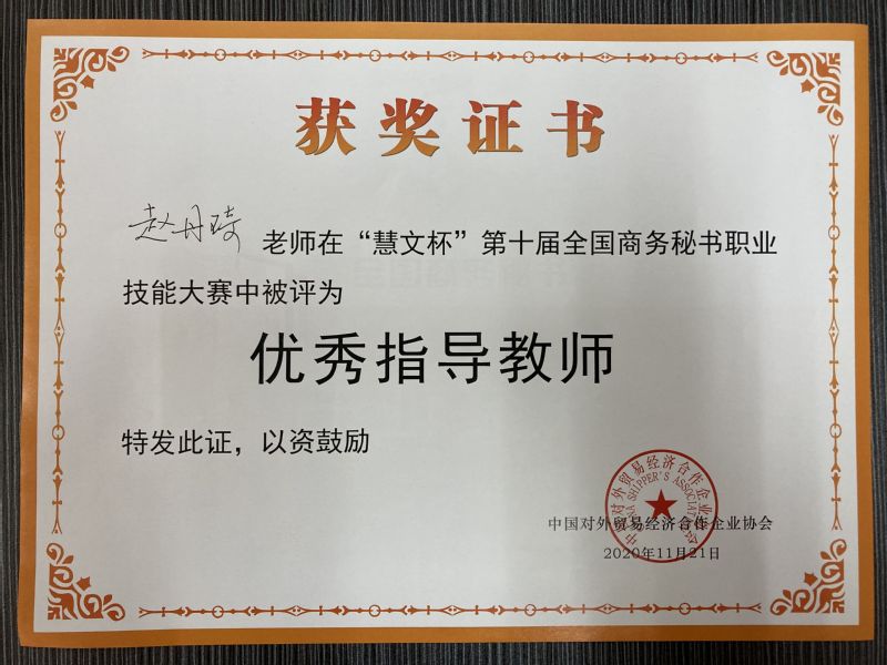 【获奖】av电影 赵丹琦、王军老师被评为“慧文杯”第十届全国商务秘书职业技能大赛优秀指导教师