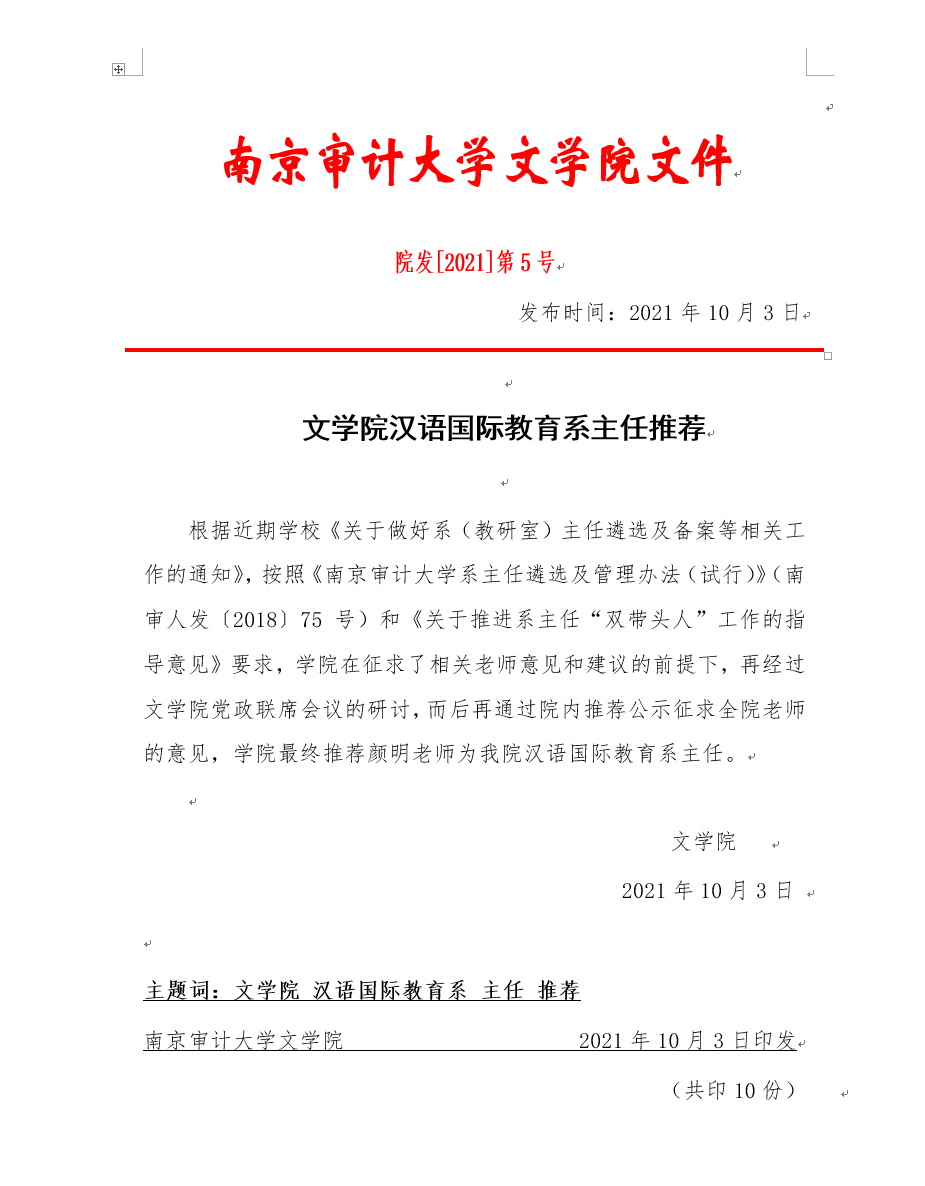 根据近期学校《关于做好系(教研室)主任遴选及备案等相关工作的通知》,按照《南京审计大学系主任遴选及管理办法(试行)》(南审人发〔2018〕75 号)和《关于推进系主任“双带头人”工作的指导意见》要求,学院在征求了相关老师意见和建议的前提下,再经过av电影 党政联席会议的研讨,而后再通过院内推荐公示征求全院老师的意见,学院最终推荐颜明老师为av电影 汉语国际教育系主任。