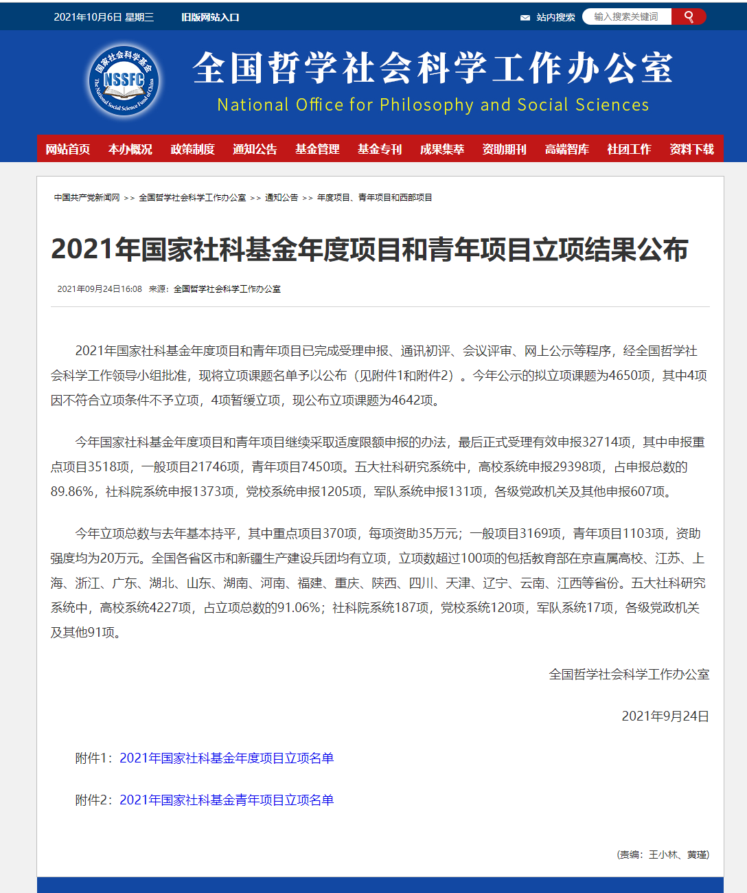 9月24日,2021年国家社科基金立项名单火热出炉。av电影 两位老师喜获立项,取得了av电影 同一年获批数量的最好成绩!