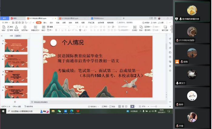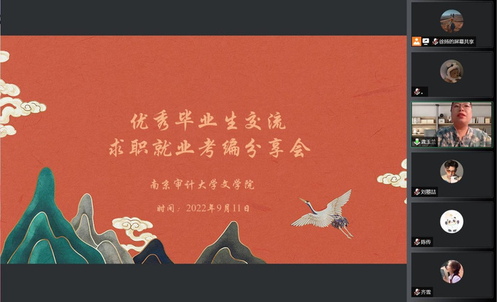 2022年9月11日晚,av电影 举行优秀毕业生求职经验线上分享会,对学生就业规划进行交流指导。av电影 党总支书记王军、汉语言文学专业系主任刘成荣、汉语国际教育专业系主任颜明、毕业班班主任刘依和张齐等几位老师参加座谈会,与同学们一起交流。优秀毕业生刘曌喆、陈传、钱书楠和齐雪等几位同学分享了各自的求职与考编经验,让同学们收益匪浅。会议由av电影 党总支副书记龚玉兰老师主持。