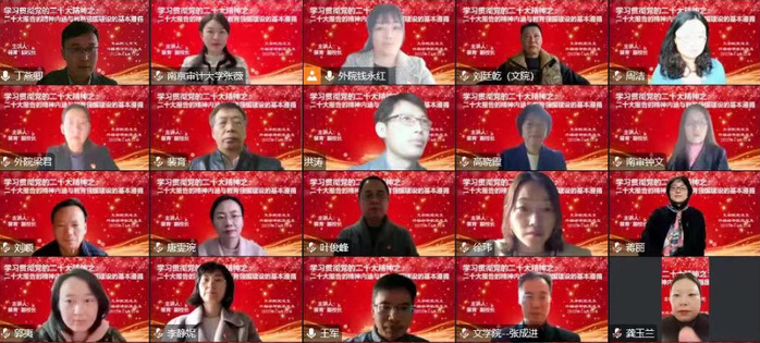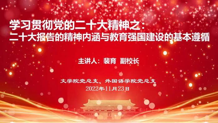 11月23日下午,av电影 和外国语学院共同组织基层党组织联学共建活动,邀请校党委常委、副校长裴育为两个学院全体党员教师开展主题为“党的二十大精神内涵与教育强国建设的基本遵循”的专题党课。本次学习由外国语学院党总支书记钱永红主持。