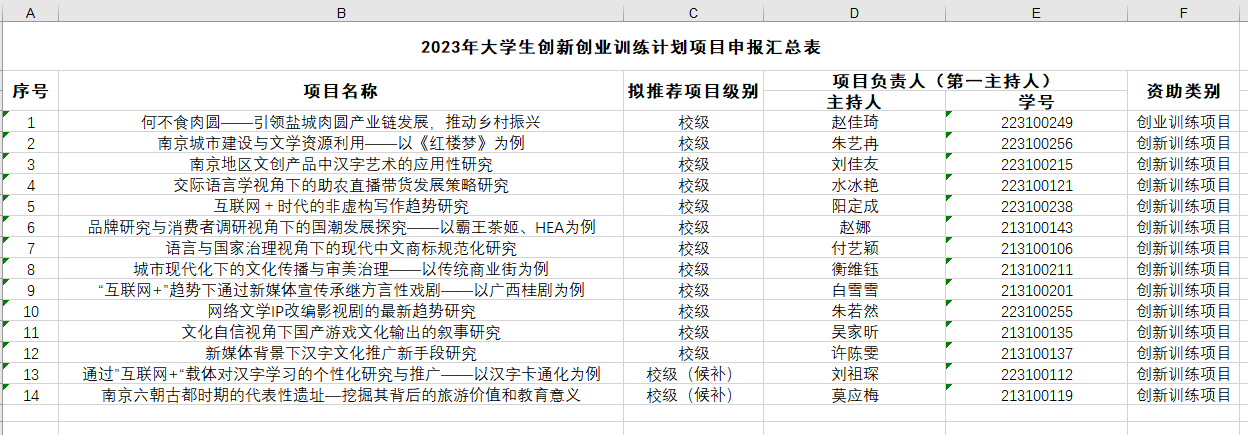 根据教务委员会发布的《关于组织2023年春学期大学生创新创业训练计划项目申报工作的通知》精神,按照《南京审计大学创新创业训练计划项目管理办法》的相关规定,经个人申报,专家评审,学院集体研究,决定推荐以下项目立项。