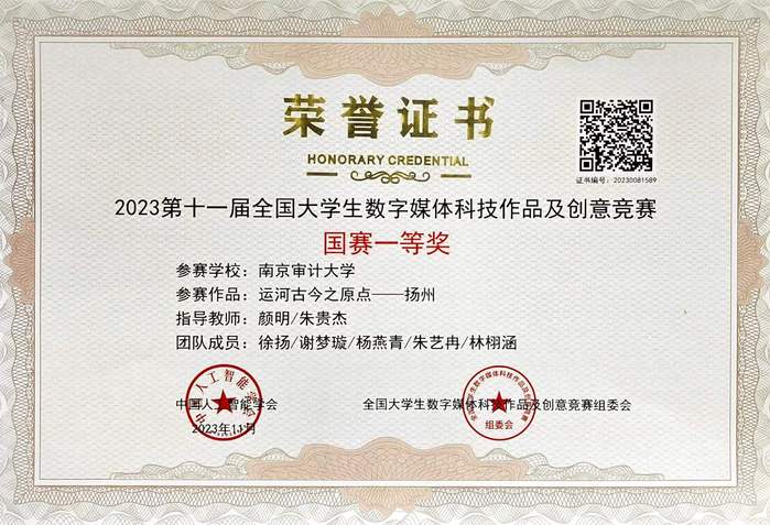 20231125第十一届全国大学生数字媒体科技作品及创意竞赛全国现场总决赛在常州举行。由南京审计大学av电影 颜明老师、扬州大学朱贵杰老师联合指导的新媒体艺术作品《运河古今之原点——扬州》荣获总决赛一等奖。参赛团队成员包括我校av电影 汉语国际教育专业研究生徐扬、谢梦璇,汉语言文学专业本科生朱艺冉,以及汉语国际教育专业本科生杨燕青、林栩涵。