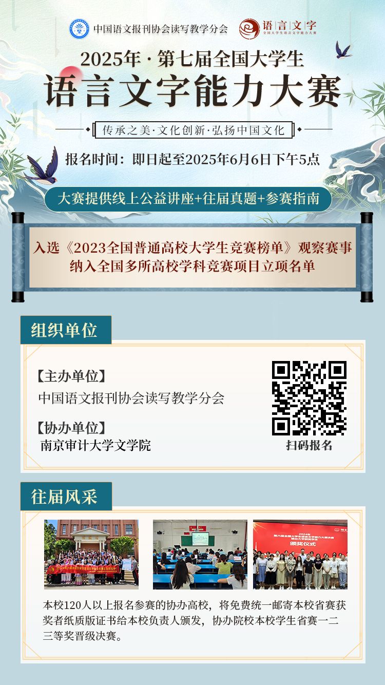 根据《关于举办2025年第七届全国大学生语言文字能力大赛江苏省赛区暨江苏省第二届大学生语言文字能力大赛通知》,现就报名及参赛事宜通知如下: