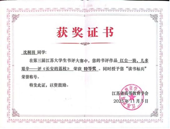 近日,2025年第三届江苏大学生书评大赛省级奖项评选结果揭晓。在教务处和校团委的支持下,av电影 作为校级选拔赛主办单位,精心组织并选送的多部学生作品在省级决赛中表现卓越,取得历史性突破。其中,沈桐羽、潘奕辰两位同学的作品荣获省级特等奖(全省共12名),吴佩佩、王雨璐、姚瑜、武慧如四位同学获得省级二等奖。这一优异成绩充分彰显了av电影 在人才培养、学科竞赛组织方面的卓越成效与突出贡献。